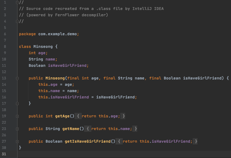 마지막으로 직접 Lombok을 통해 변환된 코드를 확인해보자.