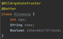 생성된 .class 확인해보면 아래와 같이 Lombok에 의해 모든 변수를 초기화하는 생성자와, getter가 생성된 것을 확인할 수 있다.