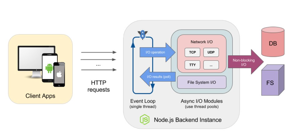 JS의 비동기 특성으로 인해 모든 nodejs시스템 라이브러리 파일 읽기 또는 HTTP파일 전송과 같은 IO작업을 위한 이벤트 및 비동기 API를 제공함.