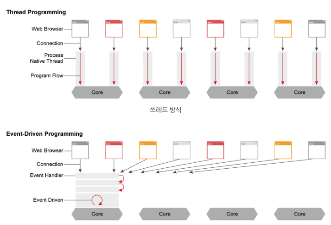 이렇게 스레드 기반은 하나의 커넥션 당 하나의 스레드를 점유한다. 즉 불필요한 자원까지 점유하게 된다. 하지만 이벤트 드라이븐 방식은 여러개의 커넥션을 몽땅 다 Event Handler를 통해 비동기 방식으로 처리해, 먼저 처리되는 것부터 로직이 진행되도록 함.